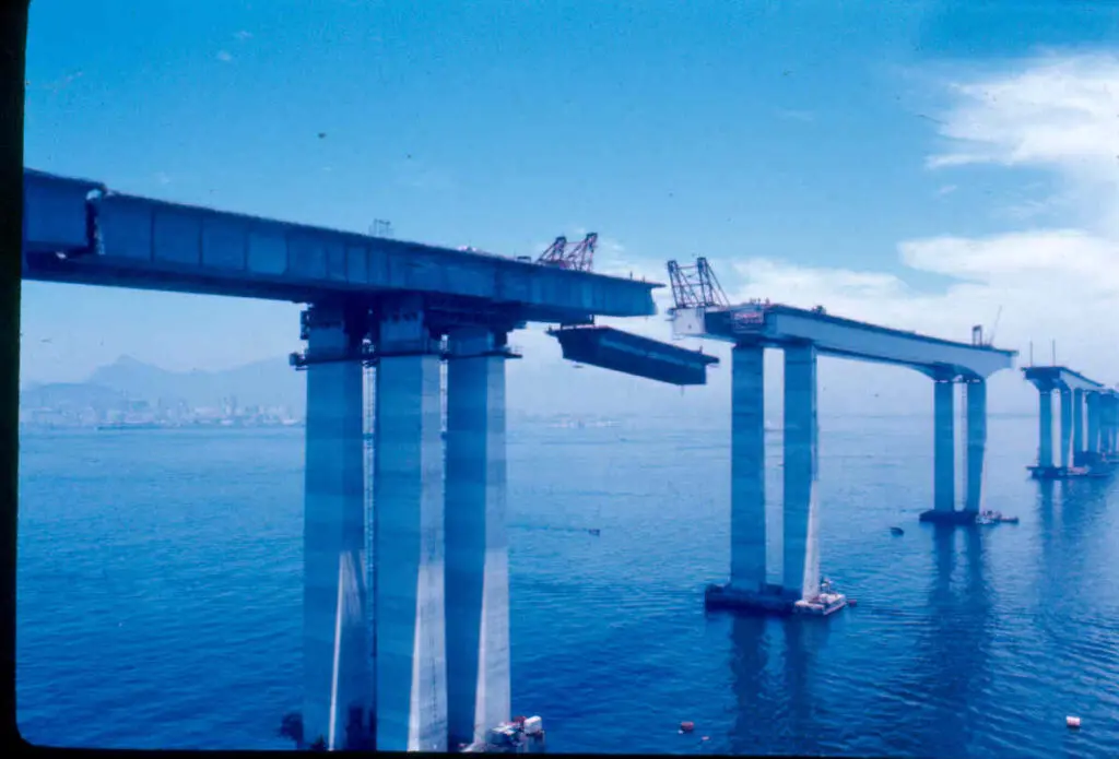 The entire structure that was used in the construction of the Rio-Niterói Bridge was manufactured in England in modules that arrived in Brazil by sea. This import was quite difficult, due to the movement in Guanabara Bay.
